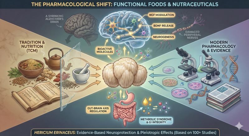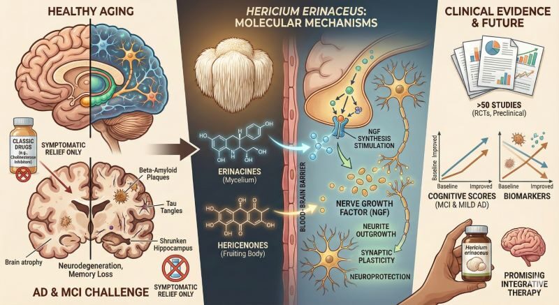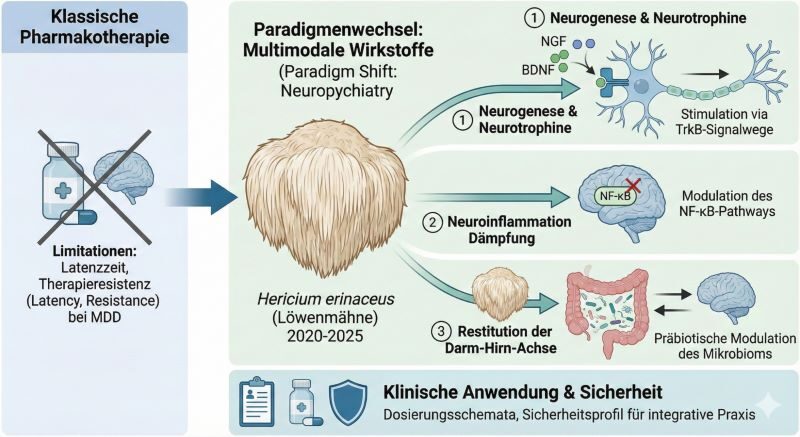 Inhaltsverzeichnis 1. Einleitung und wissenschaftlicher Kontext1.1 Botanische und Mykologische Charakteristika2. Phytochemie und Pharmakognosie: Das duale Wirkstoffprofil2.1 Die Cyathan-Diterpenoide: Erinacine (Myzel-spezifisch)2.2 Die Meroterpenoide: Hericenone (Fruchtkörper-spezifisch)2.3 Polysaccharide und Beta-Glucane2.4 Extraktionsmethodik als Qualitätsfaktor3. Vertiefte Molekularbiologie: Neurotrophine und Signalwege3.1 Der NGF-TrkA-Signalweg3.2 Die BDNF/TrkB-Achse und die Bedeutung von Pro-BDNF3.3 Anti-Neuroinflammation: NLRP3 und Zytokin-Modulation4. Die Darm-Hirn-Achse: Mikrobiom als therapeutisches Target4.1 Modulation