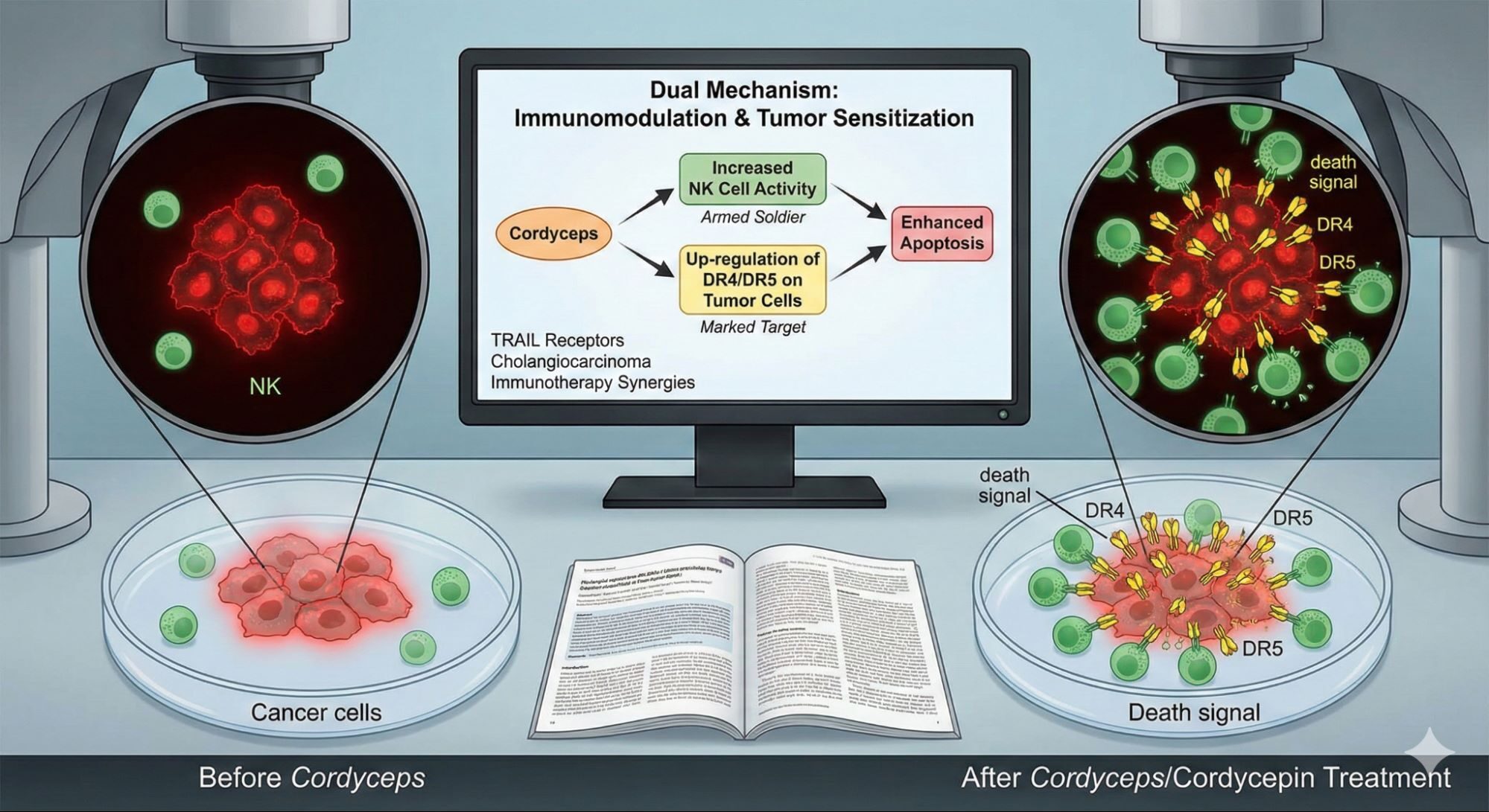 Die immunmodulatorische Wirkung von Cordyceps ist raffinierter als eine reine, unspezifische Stimulation. Neuere Forschungen deuten auf einen dualen Wirkmechanismus hin: Cordyceps fungiert nicht nur als "Immun-Booster", sondern auch als "Tumor-Sensitizer". Eine Studie an Cholangiokarzinom-Zellen (CCA) – einem oft tödlichen Krebstyp – lieferte hierzu beeindruckende Belege.[25,25]