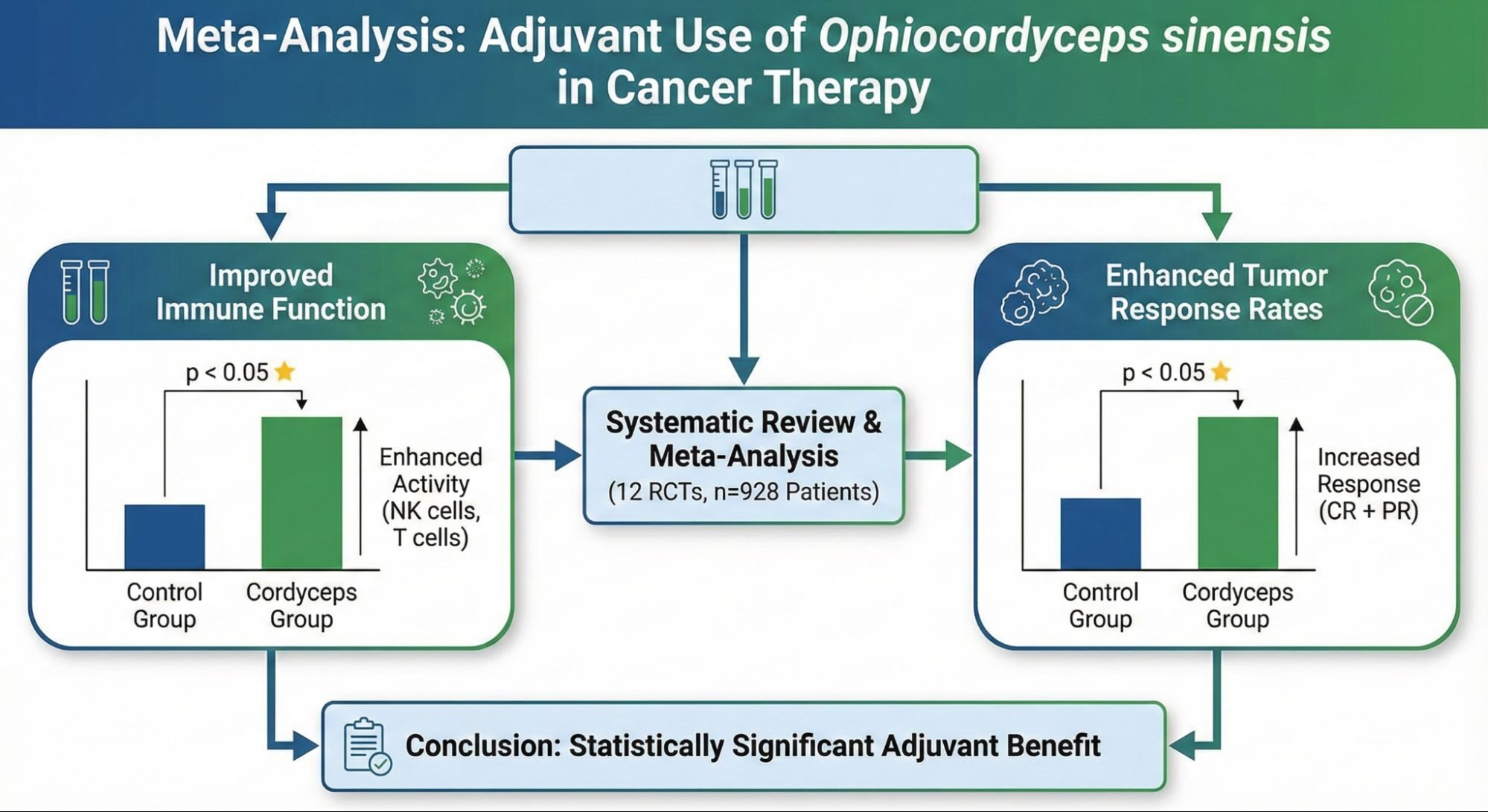 Die überzeugendste Evidenz für den praktischen Nutzen von Cordyceps stammt aus systematischen Reviews und Meta-Analysen, die seine Rolle als Adjuvans untersuchen. Ein zentraler systematischer Review, der 12 randomisierte klinische Studien (RCTs) mit insgesamt 928 Krebspatienten einschloss, liefert hierfür eine solide Grundlage.[12] Die Ergebnisse dieser Meta-Analyse zeigten, dass die adjuvante Gabe von Ophiocordyceps sinensis zu einer statistisch signifikanten Verbesserung sowohl der Immunfunktion als auch der Tumor-Ansprechraten führte.[12]