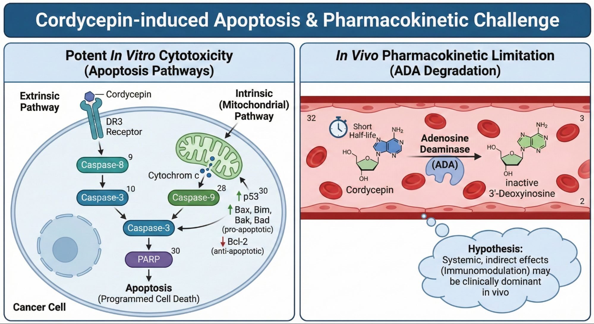 Es ist jedoch eine wichtige pharmakokinetische Einschränkung zu beachten: In vivo hat Cordycepin oft eine kurze Halbwertszeit, da es durch das Enzym Adenosindeaminase (ADA) schnell zu 3'-Desoxyinosin, einem inaktiven Metaboliten, abgebaut wird.[32] Dies bedeutet, dass die in vitro beobachteten, Konzentrations-abhängigen Apoptose-Effekte in vivo schwerer zu erreichen sein könnten. Dies stärkt die Hypothese, dass bei oraler Einnahme die systemischen, indirekten Effekte (Immunmodulation, ADR-Reduktion) klinisch dominanter sein könnten als die direkte Zytotoxizität. [3,2]