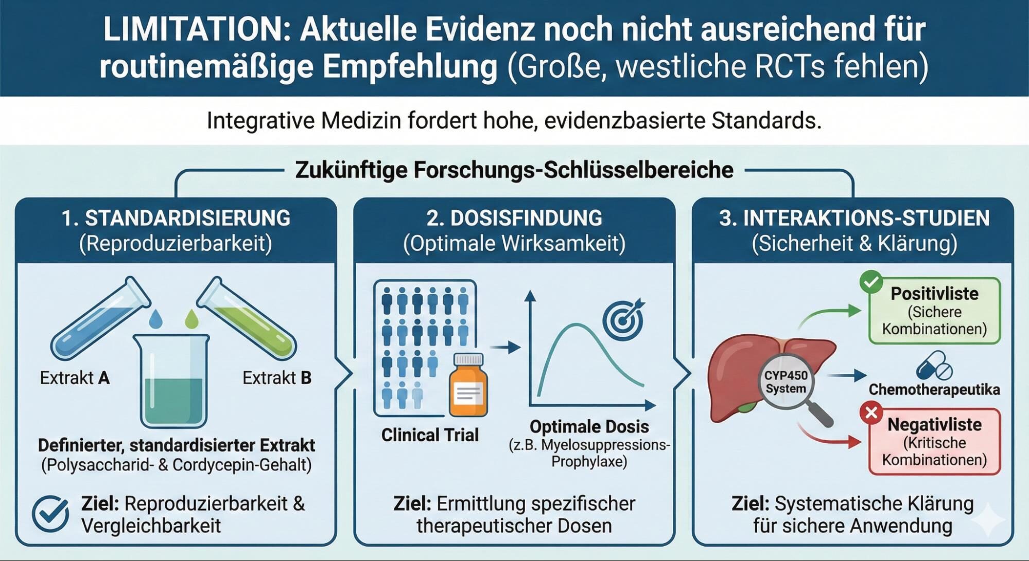 Trotz dieser positiven und optimistisch stimmenden Signale ist die wissenschaftliche Evidenz, insbesondere aus großangelegten, westlichen RCTs, noch nicht ausreichend, um die routinemäßige Anwendung von Cordyceps-Präparaten für alle Krebspatienten zu empfehlen.[14] Die integrative Medizin muss ihren eigenen hohen, evidenzbasierten Ansprüchen genügen. [14]