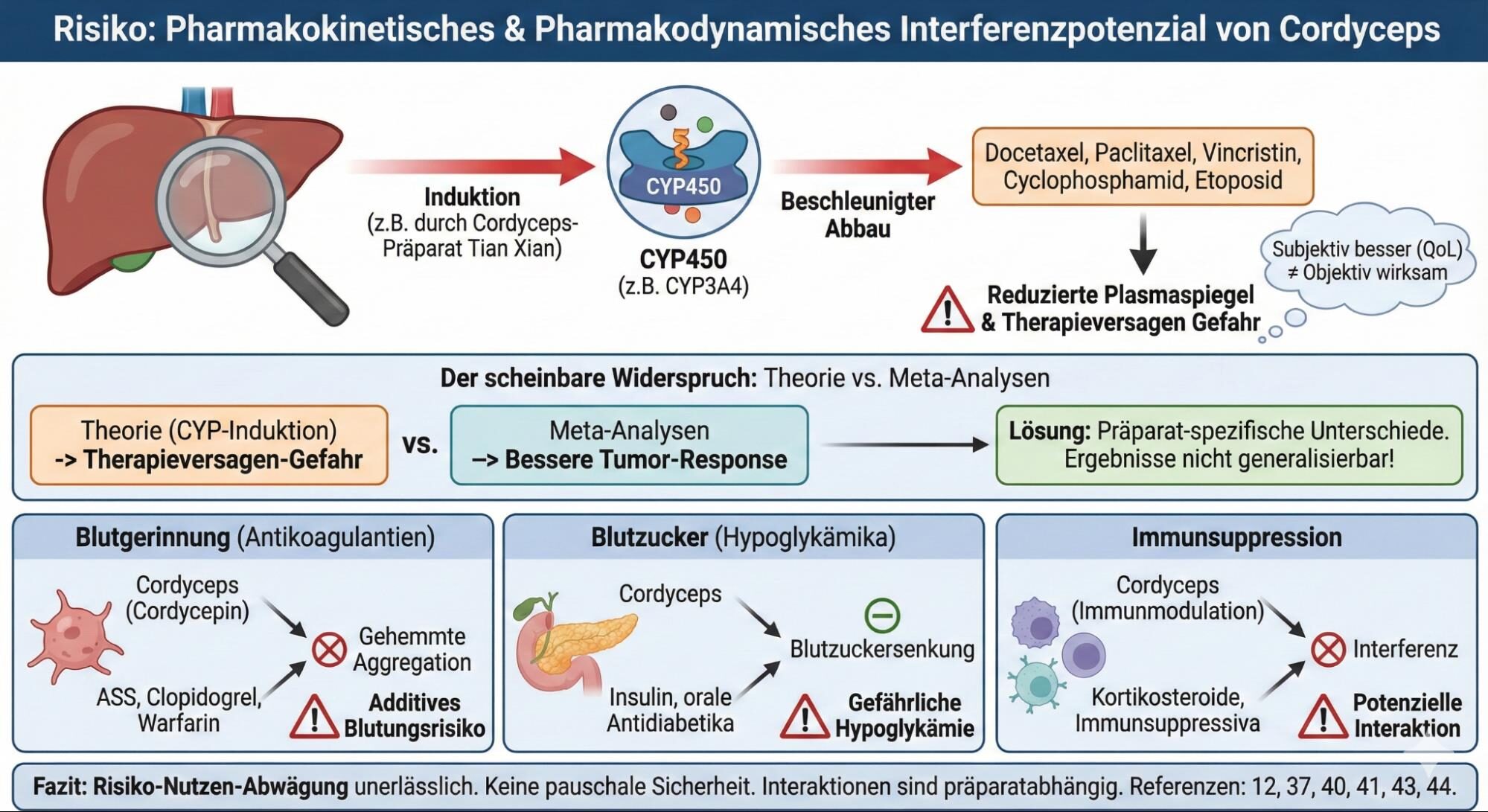 Das größte Risiko bei der praktischen Anwendung von Cordyceps liegt nicht in seiner inhärenten Toxizität, sondern in seinem pharmakokinetischen und pharmakodynamischen Interferenzpotenzial mit konventionellen onkologischen Medikamenten.[43]