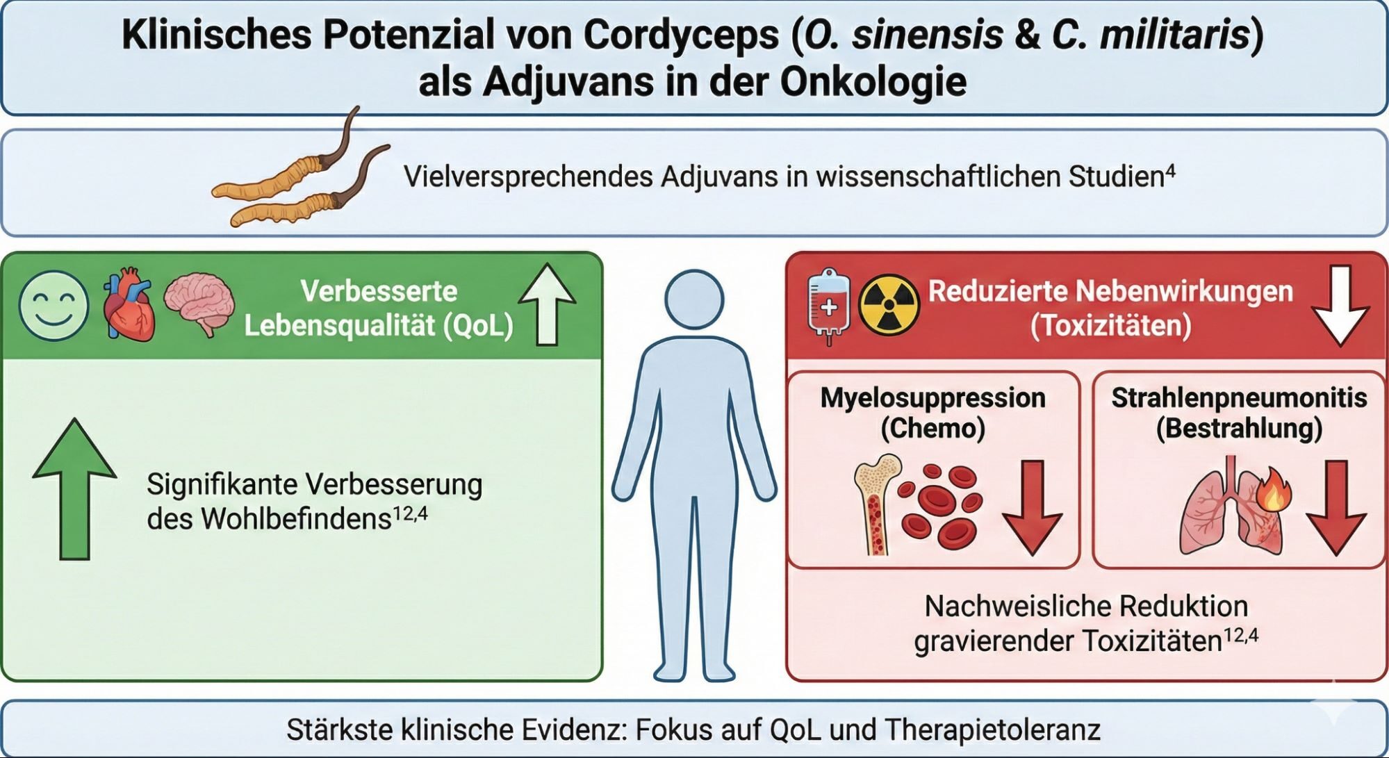 Cordyceps, insbesondere die Arten O. sinensis und C. militaris, hat sich in einer wachsenden Zahl von wissenschaftlichen Studien als ein vielversprechendes Adjuvans in der integrativen Onkologie erwiesen.[4] Die stärkste klinische Evidenz liegt derzeit in seiner Fähigkeit, die Lebensqualität (QoL) von Krebspatienten signifikant zu verbessern und die gravierenden Nebenwirkungen konventioneller Therapien – insbesondere die Myelosuppression durch Chemotherapie und die Strahlenpneumonitis durch Strahlentherapie – nachweislich zu reduzieren.[12,4]