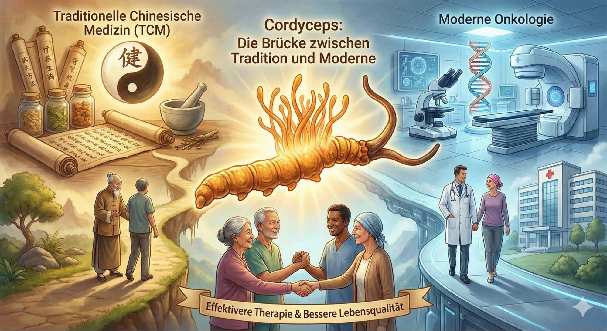 Cordyceps repräsentiert eindrucksvoll das Potenzial der "Mykomedizin" an der Schnittstelle von traditionellem Wissen und moderner Wissenschaft. Korrekt verstanden und evidenzbasiert angewendet, bietet dieser Pilz einen wissenschaftlich fundierten Ansatz, um die Brücke zwischen Traditioneller Chinesischer Medizin [3] und moderner Onkologie [5] zu schlagen. Das Ziel ist dabei stets, die Krebstherapie nicht nur effektiver, sondern für den Patienten auch verträglicher und lebenswerter zu gestalten.[3]
