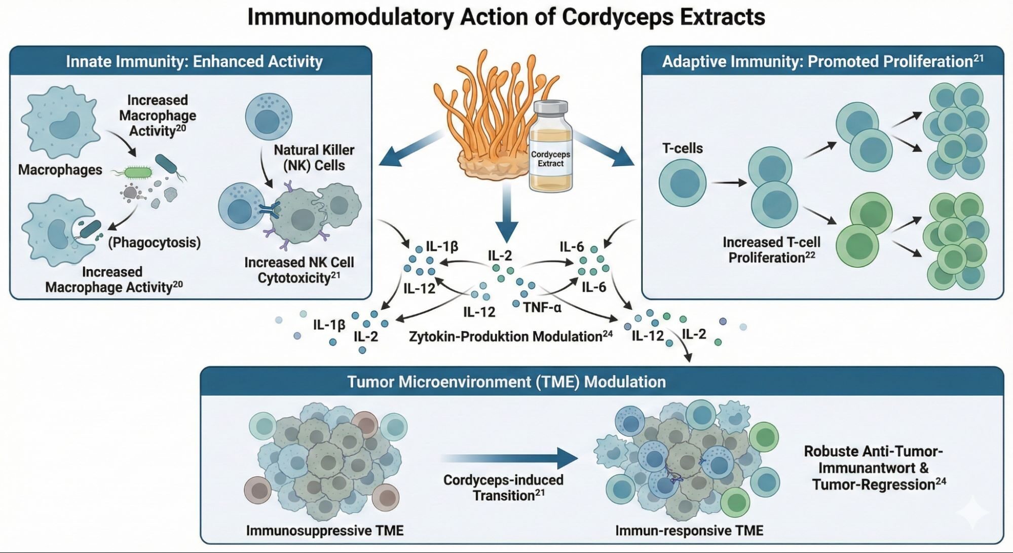 Die Forschung zeigt, dass Cordyceps-Extrakte die Aktivität von Schlüsselzellen der angeborenen Immunität, wie Natürliche Killerzellen (NK-Zellen) und Makrophagen, steigern können.[21] Parallel dazu wird die adaptive Immunität durch eine nachgewiesene Steigerung der T-Zell-Proliferation gefördert.[22] Diese Aktivierung wird durch eine komplexe Modulation der Zytokin-Produktion vermittelt. Cordyceps stimuliert die Freisetzung von pro-inflammatorischen und immunstimulierenden Zytokinen wie Interleukin (IL)-1β, IL-2, IL-6, IL-12 und Tumornekrosefaktor (TNF)-α.[20] Diese Zytokine wiederum sind entscheidend für die Orchestrierung einer robusten Anti-Tumor-Immunantwort und können das Tumor-Mikroklima (TME) von einem immunsuppressiven in einen immun-responsiven Zustand versetzen.[24,20]