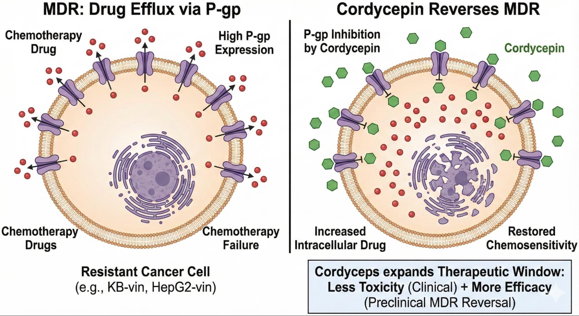 Ein für die adjuvante Anwendung hochrelevanter Mechanismus ist die Fähigkeit von Cordycepin, die Multidrug-Resistenz (MDR) zu beeinflussen. MDR ist ein Hauptgrund für das Versagen von Chemotherapien und wird oft durch die Überexpression von Effluxpumpen wie dem P-Glykoprotein (P-gp) verursacht, das die Chemotherapeutika aus der Zelle heraustransportiert, bevor sie wirken können.[35,35]