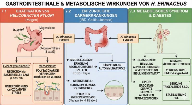 - Evidenz: In-vivo-Studien (Mausmodell) zeigten, dass H. erinaceus-Extrakte die bakterielle Last im Magen um den Faktor 10 (1 log unit) reduzierten. Entscheidend war auch die vollständige Unterdrückung von oxidativem Stress (8-oxoG) in der Magenschleimhaut, der durch das Bakterium induziert wird.[29]