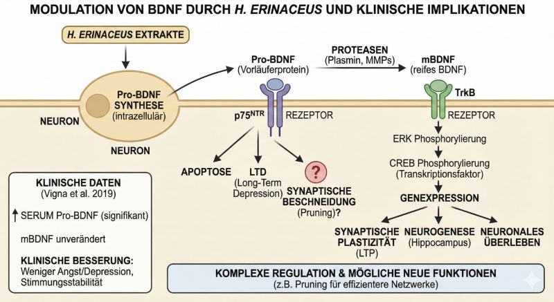 - Biochemische Interpretation: Pro-BDNF wird intrazellulär synthetisiert und extrazellulär durch Proteasen (wie Plasmin oder Matrix-Metalloproteinasen) in reifes BDNF (mBDNF) gespalten. Während mBDNF über den TrkB-Rezeptor neurotrophe Effekte vermittelt (LTP, Überleben), bindet Pro-BDNF bevorzugt an den p75NTR-Rezeptor, der oft mit Apoptose oder LTD (Long-Term Depression) assoziiert wird. Der Anstieg von Pro-BDNF unter Hericium-Gabe, begleitet von klinischer Besserung (weniger Angst/Depression), deutet auf eine komplexe Regulation hin: Möglicherweise wird der gesamte Pool an Neurotrophinen erhöht, oder Pro-BDNF übernimmt in diesem Kontext spezifische, bisher weniger verstandene trophische Funktionen, etwa die Regulation der synaptischen Beschneidung (pruning) für effizientere neuronale Netzwerke.[15]
