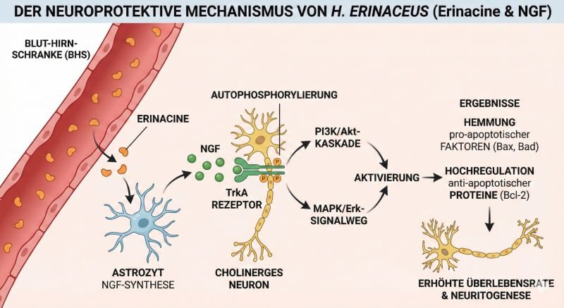 - Erinacin A: Gilt als der stärkste bisher bekannte natürliche Induktor der NGF-Biosynthese. Pharmakokinetische Studien belegen, dass Erinacin A aufgrund seiner Lipophilie und geringen Molekülmasse die Blut-Hirn-Schranke effektiv passieren kann. Im Zentralnervensystem (ZNS) stimuliert es Astrozyten zur Sekretion von NGF, was sekundär das Überleben und Wachstum cholinerger Neuronen im basalen Vorderhirn fördert.[5] Neueste Daten zeigen zudem, dass Erinacin A die Expression von Insulin-abbauendem Enzym (IDE) hochreguliert, was den Abbau von Beta-Amyloid-Plaques beschleunigen kann.[7]