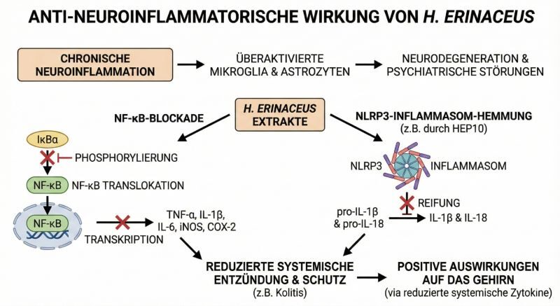 - NLRP3-Inflammasom: Neuere Studien identifizierten spezifische niedermolekulare Polysaccharide (z.B. HEP10), die die Aktivierung des NLRP3-Inflammasoms hemmen. Das NLRP3-Inflammasom ist ein multiproteiner Komplex, der die Reifung von IL-1β und IL-18 steuert. Seine Hemmung durch H. erinaceus reduziert systemische Entzündung und schützt vor Kolitis-assoziierten Gewebeschäden, was direkte positive Auswirkungen auf das Gehirn via systemischer Zytokin-Reduktion hat.[18]