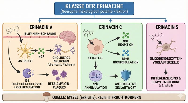 Die Klasse der Erinacine, insbesondere Erinacin A bis I, stellt aus neuropharmakologischer Sicht die potenteste Fraktion dar. Diese Cyathan-Xyloside werden exklusiv im Myzel des Pilzes synthetisiert und sind in herkömmlichen Fruchtkörper-Präparaten kaum bis gar nicht enthalten.