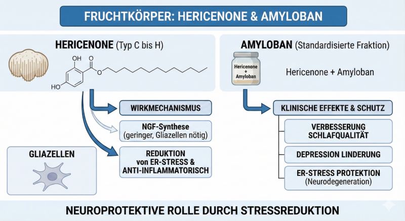 - Amyloban: Eine standardisierte Fraktion aus dem Fruchtkörper, die Hericenone und Amyloban enthält, wurde erfolgreich zur Verbesserung der Schlafqualität und bei Depression eingesetzt. Es wird angenommen, dass Amyloban protektiv gegen ER-Stress wirkt, der bei neurodegenerativen Prozessen eine zentrale Rolle spielt.[9]