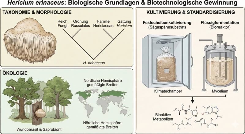 Taxonomisch wird Hericium erinaceus der Familie der Hericiaceae innerhalb der Ordnung Russulales zugeordnet. Morphologisch unterscheidet sich der Pilz signifikant von klassischen Hutpilzen: Sein Fruchtkörper (Basidiokarp) besteht aus einer kompakten, knollenartigen Basis, von der dichte Kaskaden weicher, stachelartiger Hymenophoren herabhängen. Diese vergrößerte Oberfläche dient der Sporenfreisetzung. Ökologisch fungiert er als Wundparasit und Saprobiont an Laubhölzern, präferiert Eichen (Quercus) und Buchen (Fagus) in den gemäßigten Breiten der nördlichen Hemisphäre.[1] Die Kultivierung erfolgt heute weltweit auf Sägespänesubstraten oder in Flüssigfermentation, was eine Standardisierung der Wachstumsbedingungen und damit eine reproduzierbare Gewinnung bioaktiver Metaboliten ermöglicht.[2]