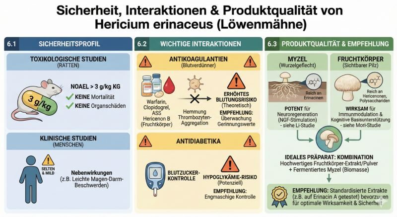 Hericium erinaceus gilt als extrem sicher. Toxikologische Studien an Ratten (bis zu 3 g/kg Körpergewicht) zeigten keine Mortalität oder Organschäden (NOAEL > 3 g/kg).[22] Auch in den klinischen Studien waren Nebenwirkungen selten und mild (z.B. leichte gastrointestinale Beschwerden).[17]