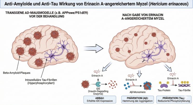 In transgenen AD-Mausmodellen (z.B. APPswe/PS1dE9) führte die Gabe von Erinacin A-angereichertem Myzel zu einer signifikanten Reduktion der Beta-Amyloid-Plaques.[12]