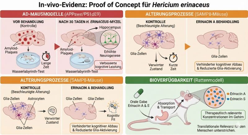 • AD-Mausmodelle: Eine 30-tägige Behandlung mit H. erinaceus-Myzel reduzierte in APPswe/PS1dE9-Mäusen nicht nur die Plaque-Last, sondern verbesserte auch die kognitive Leistung im Wasserlabyrinth-Test signifikant. Zudem wurde eine erhöhte Neurogenese im Hippocampus nachgewiesen.[12]