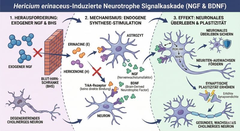 • Mechanismus: Erinacine und Hericenone binden nicht direkt an TrkA-Rezeptoren, sondern stimulieren Astrozyten und Neuronen zur Produktion von NGF und BDNF (Brain-Derived Neurotrophic Factor).[1]